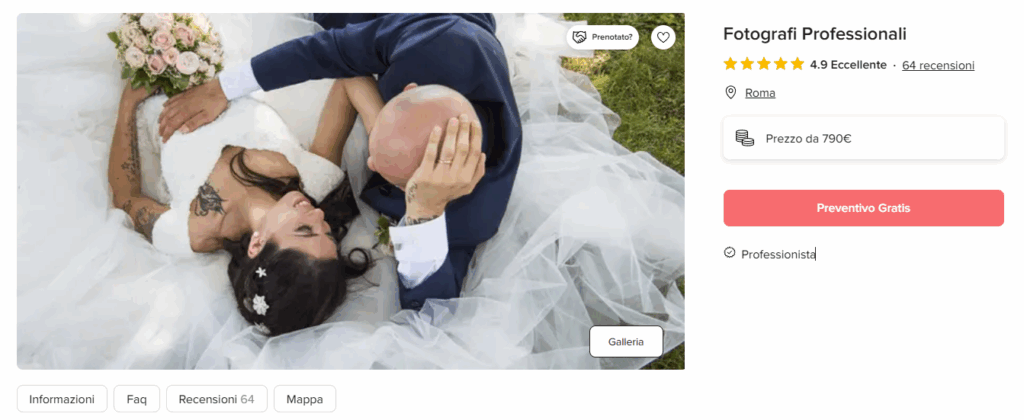 ECCELLENTE In base a 115 recensioni Pubblicato su Morena GrossiTrustindex verifica che la fonte originale della recensione sia Google. Abbiamo conosciuto Eleonora e il suo staff su Instagram e abbiamo deciso di sceglierle per fare un servizio Newborn per nostra figlia... è stato tutto impeccabile: dell'accoglienza e l'ambiente (sembrava di essere a casa), dalla loro disponibilità, dalla dolcezza con cui hanno gestito nostra figlia e dalla bellezza delle foto. Direi piu che consigliate. Grazie.Pubblicato su Flaminia AmorosoTrustindex verifica che la fonte originale della recensione sia Google. Abbiamo fatto il servizio prenatal ed Eleonora è stata molto gentile e ci ha aiutato a metterci a nostro agio in una situazione "poco spontanea". Le foto sono super carine!!Pubblicato su GiorgiaTrustindex verifica che la fonte originale della recensione sia Google. Servizio fotografico premaman! Non amo stare davanti all’obiettivo e credevo che mi sarei sentita in imbarazzo invece non è stato affatto così. Mi sono divertita tantissimo e ho condiviso questo momento con mio marito, anche lui tutt’altro che a suo agio davanti ad una fotocamera. Le foto che ci hanno fatto sono davvero bellissime. Torneremo sicuramente col nostro piccolino!Pubblicato su Romina AronTrustindex verifica che la fonte originale della recensione sia Google. Abbiamo avuto il piacere di fare un servizio fotografico smash cake per il primo compleanno di nostro figlio, e l'esperienza è stata semplicemente fantastica! Ogni dettaglio è stato curato con molta attenzione: dalla scenografia alla torta, tutto è stato perfetto e ha reso il momento ancora più speciale. La fotografa è stata incredibile, capace di cogliere ogni emozione e di rendere ogni scatto unico e indimenticabile. Siamo davvero felici di aver scelto questo servizio per immortalare uno dei momenti più belli della nostra vita. Grazie di cuore per aver creato ricordi così preziosi per noi.Pubblicato su Annalisa FulcoTrustindex verifica che la fonte originale della recensione sia Google. Abbiamo contattato FotografiProfessionali per eseguire il servizio fotografico del battesimo della nostra Lavinia. Eleonora con professionalità e bravura ha realizzato bellissime foto a casa e in chiesa mettendo tutti a proprio agio. ConsigliatissimiPubblicato su GirgioTrustindex verifica che la fonte originale della recensione sia Google. Abbiamo fatto il Servizio “My Prenatal Book” , ed è stata una esperienza meravigliosa! Eleonora è una grande professionista, ti mette subito a tuo agio, gli scatti sono unici ed emozionanti!! Un emozione che porteremo sempre con noi !!Pubblicato su Gabriella ZumboTrustindex verifica che la fonte originale della recensione sia Google. Vorrei condividere il nostro feedback positivo sul servizio fotografico di Carnevale eseguito ieri con mio figlio di 9 mesi. Sia Eleonora che Roberta sono state capaci di mettere a suo agio il piccolo Leo per catturarne sorrisi ed espressioni naturali che rimarranno per sempre nei nostri ricordi. Le stampe sono di ottima qualità, inoltre, Eleonora è stata molto disponibile anche nel riprogrammare il servizio per venire incontro alle nostre esigenze. Studio fotografico accogliente, pulito e parcheggio riservato ai clienti (ottimo plus in una città caotica come Roma).Pubblicato su Roberto CensiTrustindex verifica che la fonte originale della recensione sia Google. La nostra esperienza con Eleonora ,nel suo studio fotografico ,è stata davvero spettacolare … Lei è molto professionale ,gentile e dolce ! Ci fa sentire a nostro agio,ci consiglia e vi aiuta in tutto ! Da lei e con lei abbiamo fatto tanti servizi fotografici :lo smash cake ,di Natale ,di carnevale ,per la festa della mamma e del papà etc ! Consiglio assolutamente ❤️Pubblicato su A. ChiricoTrustindex verifica che la fonte originale della recensione sia Google. Professionali, veloci e al giusto prezzo!Pubblicato su Manuela SpiezioTrustindex verifica che la fonte originale della recensione sia Google. Senza di loro il mio matrimonio non sarebbe stato così perfetto! I prezzi sono super competitivi e la loro professionalità è impagabile. E' stata un'esperienza divertente anche grazie alla loro discrezione ed empatia. Ho usufruito sia dei fotografi che del videomaker, ci hanno fatto scegliere in consulenza lo stile che avremmo apprezzato di più in base ai gusti personali ed il risultato è stato incredibile. I numeri uno a Roma!